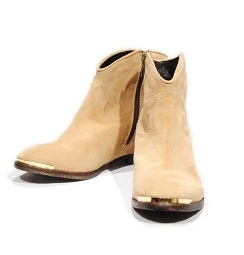 イタリアLe Mare' のショートブーツは、ベージュスエードの柔らかな雰囲気に、トゥのメタルプレートがさりげないアクセントとして効いています。履き口のVカットが足首をスッキリと綺麗に見せてくれる、シーズン問わず長く履ける一足です。